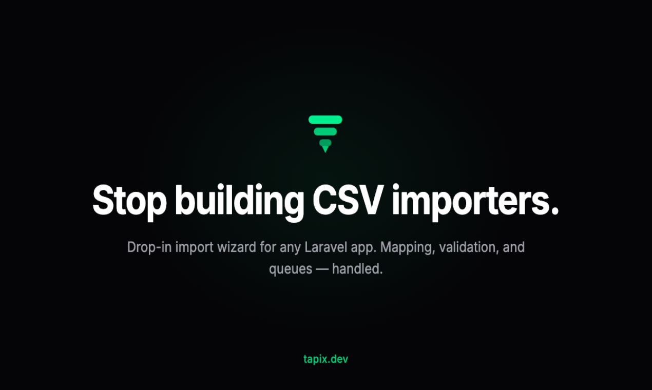 Drop-in CSV import package for Laravel. Smart column mapping, inline validation, relationship linking, and queue-powered processing. Works with any Laravel app, first-class Filament integration.