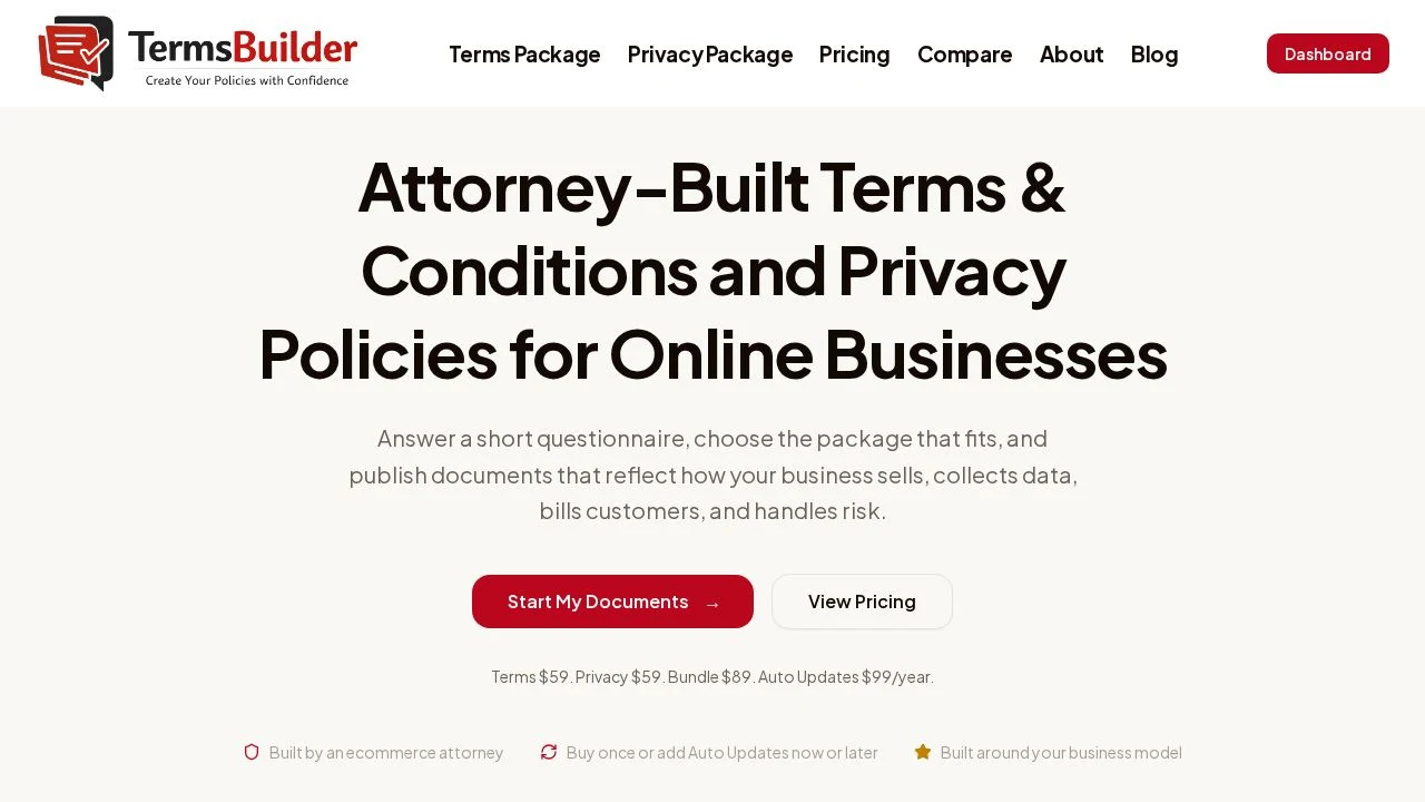 TermsBuilder is an attorney-built legal document generator for online businesses that need Terms and Conditions, Privacy Policies, hosted legal pages, and managed legal updates.