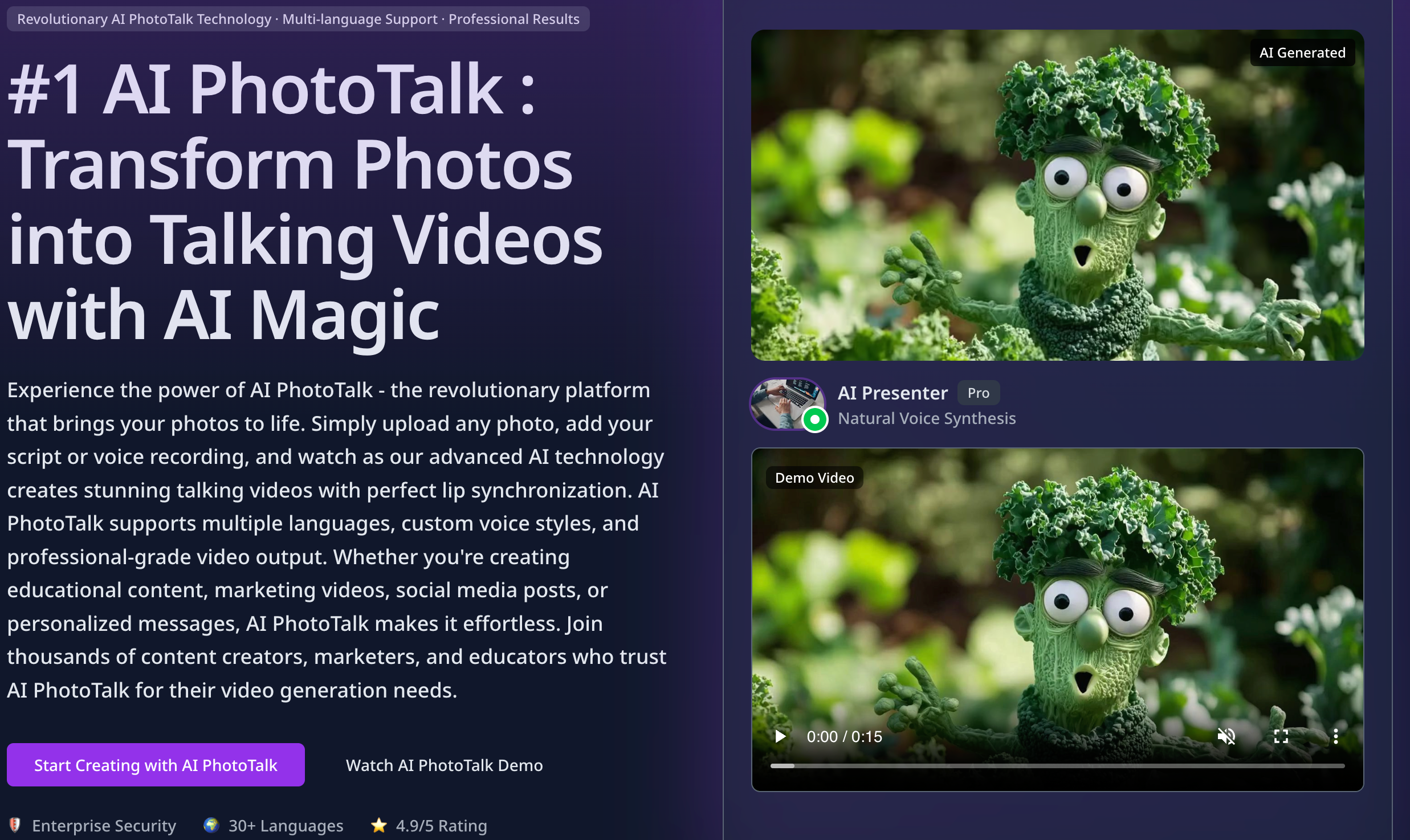 AI PhotoTalk is an innovative platform that leverages advanced artificial intelligence technology to transform any photo into a professional talking video. With its cutting-edge features, users can create realistic photo animations that include perfect lip synchronization, multi-language voice synthesis, and stunning 4K video quality. This tool is ideal for various applications, including education, marketing, and business presentations.
