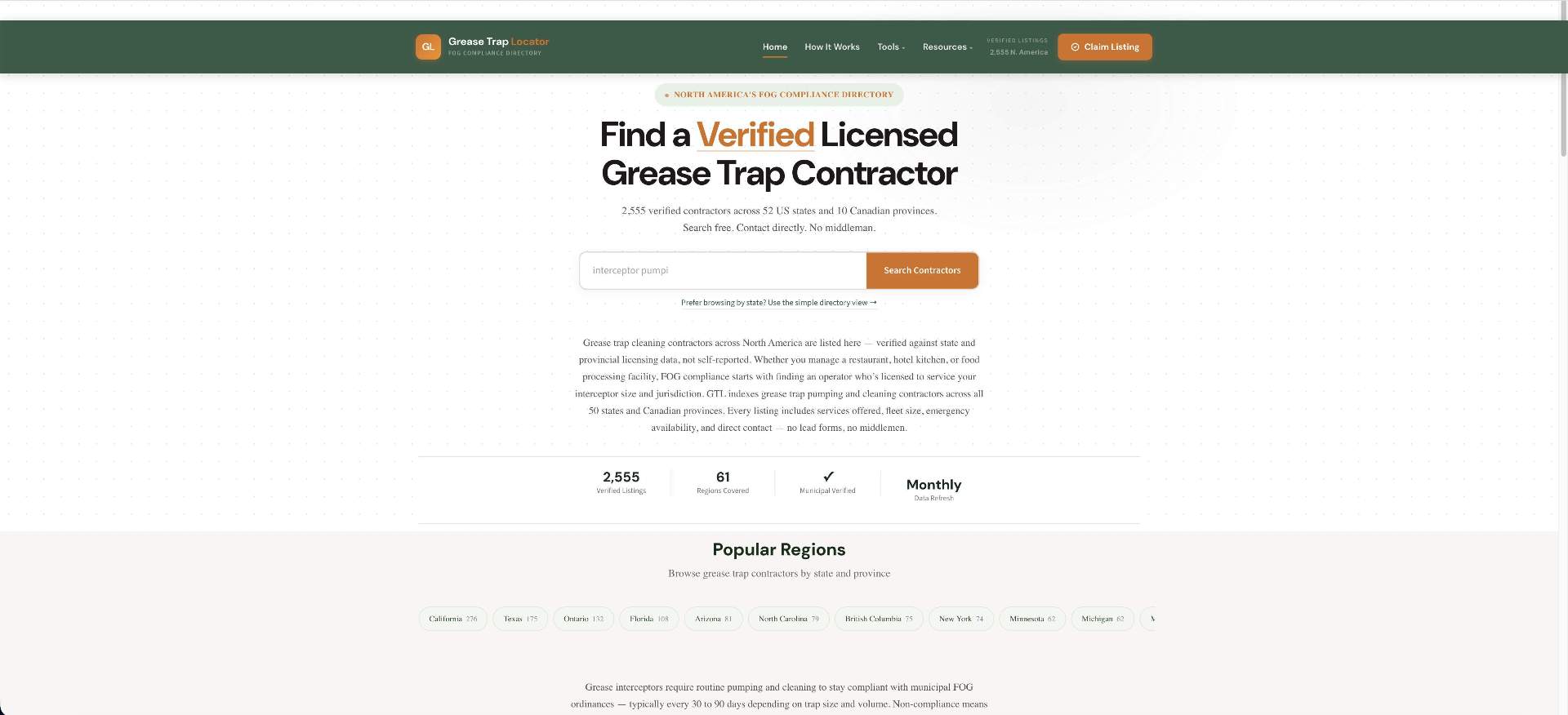 Built for the fragmented, compliance-driven FOG services market where no central resource previously existed. Currently live with 1,386 verified operator listings and growing.