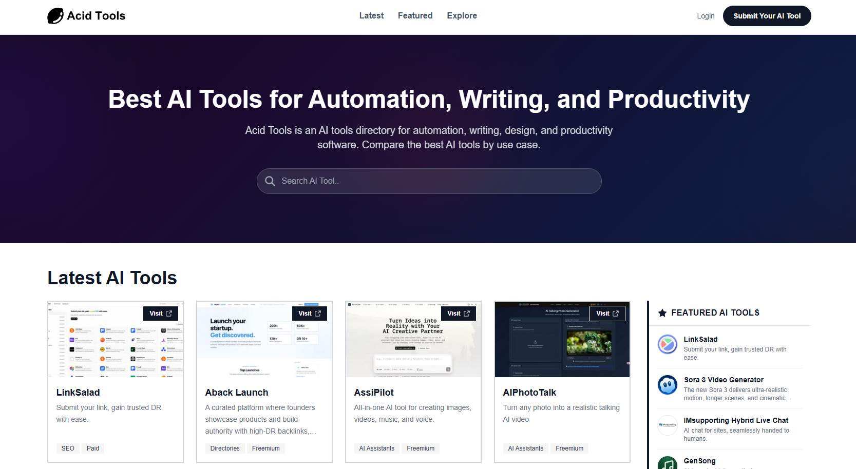 Acid Tools is a curated directory featuring the latest and most powerful AI and productivity tools across a wide range of categories, including content creation, SEO, business, marketing, design, development, and more. Whether you're a freelancer, startup founder, marketer, or tech enthusiast, Acid Tools helps you discover top-rated software that boosts efficiency and creativity. Easily browse through categories like AI assistants, image editing, chatbots, analytics, and productivity to find tools that match your goals. With fresh listings and featured recommendations, Acid Tools is your one-stop platform for staying ahead in the fast-evolving world of tech and automation.