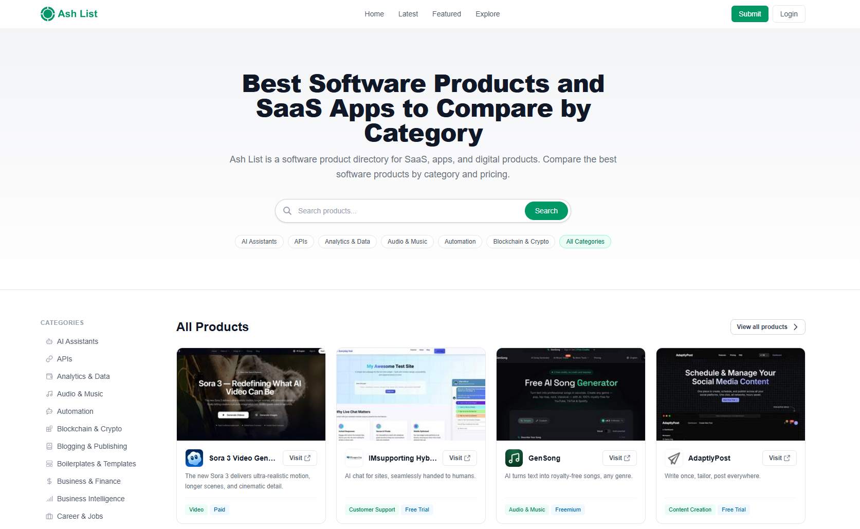 Ash List is a comprehensive directory of AI tools, SaaS platforms, and software designed to boost productivity, streamline workflows, and automate tasks. Whether you're a developer, entrepreneur, marketer, or creative, Ash List helps you discover the best tools tailored to your needs. Explore hundreds of categorized tools—from AI assistants and image generators to marketing, education, finance, and beyond. Stay ahead with curated featured tools, up-to-date listings, and real user data. If you’ve built a product, submit it to reach an active tech-savvy community, gain exposure, and track analytics on views and clicks. With an intuitive interface and growing database, Ash List makes it easy to find and compare cutting-edge solutions to supercharge your projects and business. Discover the future of software, all in one place.
