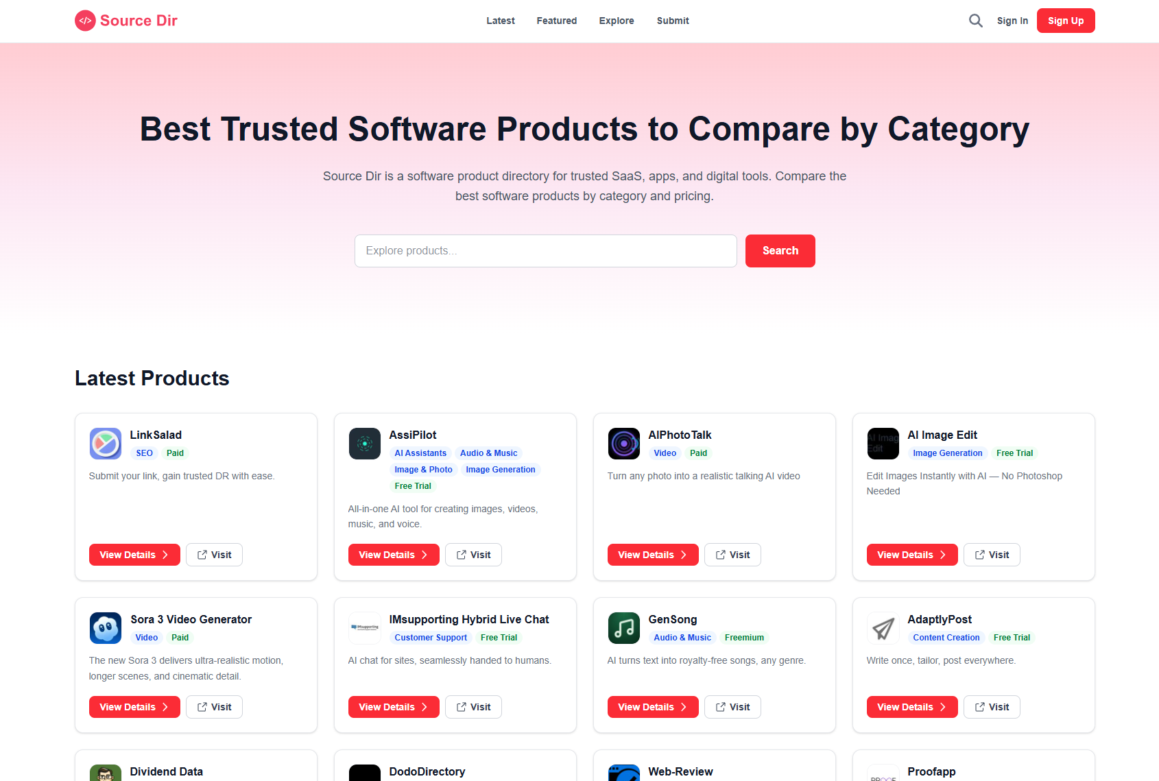 Source Dir is a curated directory of premium AI tools tailored for professionals and high-performance teams. We feature only the most advanced, high-quality AI solutions to help users enhance productivity, streamline operations, and achieve exceptional results. Whether you're in marketing, design, analytics, education, or development, Source Dir connects you with powerful software that drives innovation and growth. Discover trusted tools across dozens of categories—carefully selected for quality, utility, and professional value. Experience the future of work with Source Dir.