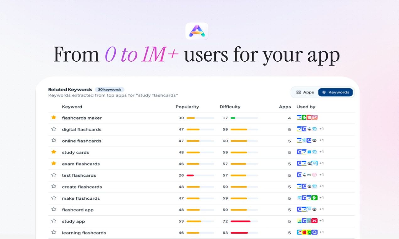 From 0 to 1M+ users for your apps. Manage AppStore metadata, keywords and more!