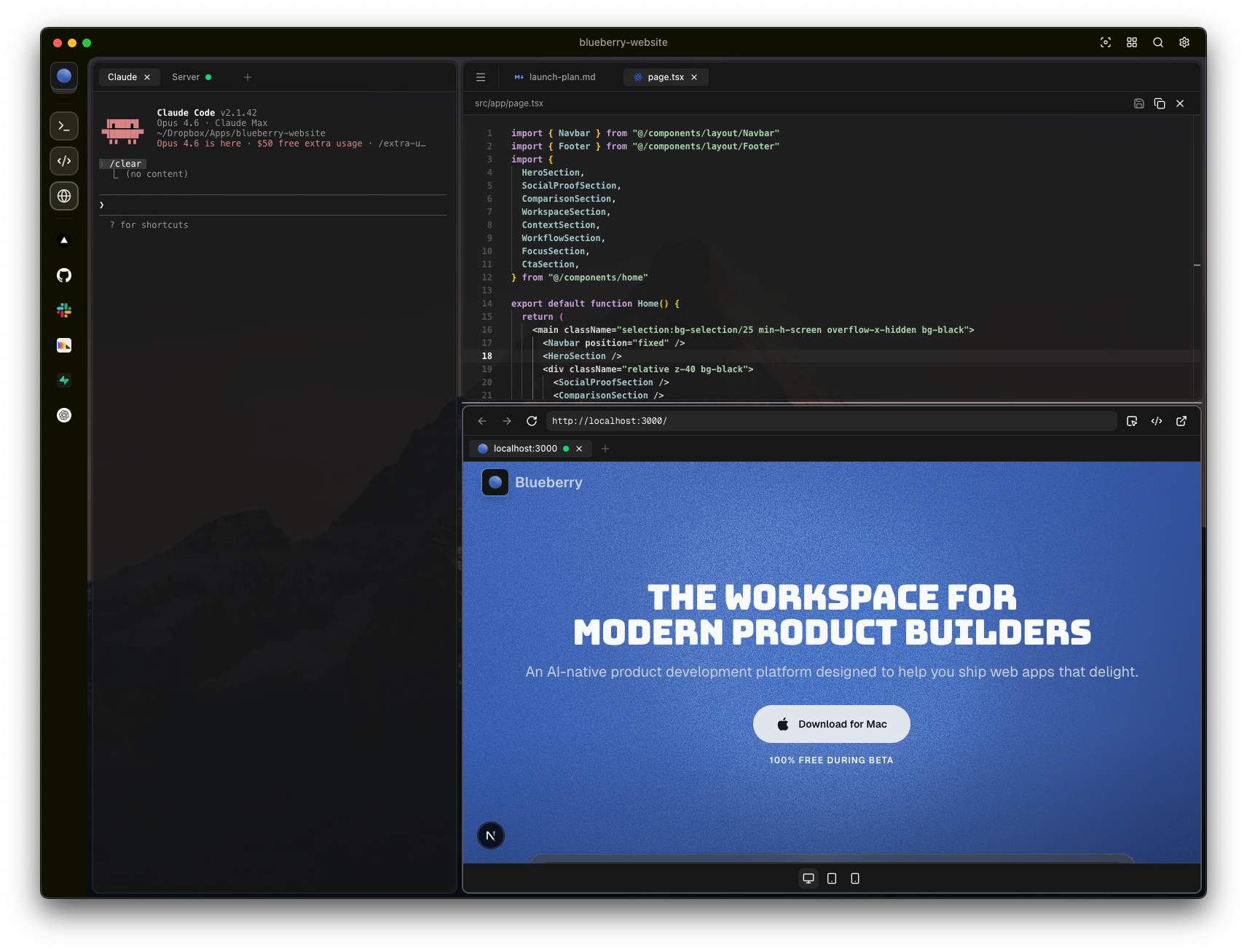 Blueberry is a mac app that puts your editor, terminal, and browser in one focused workspace. No more juggling windows.