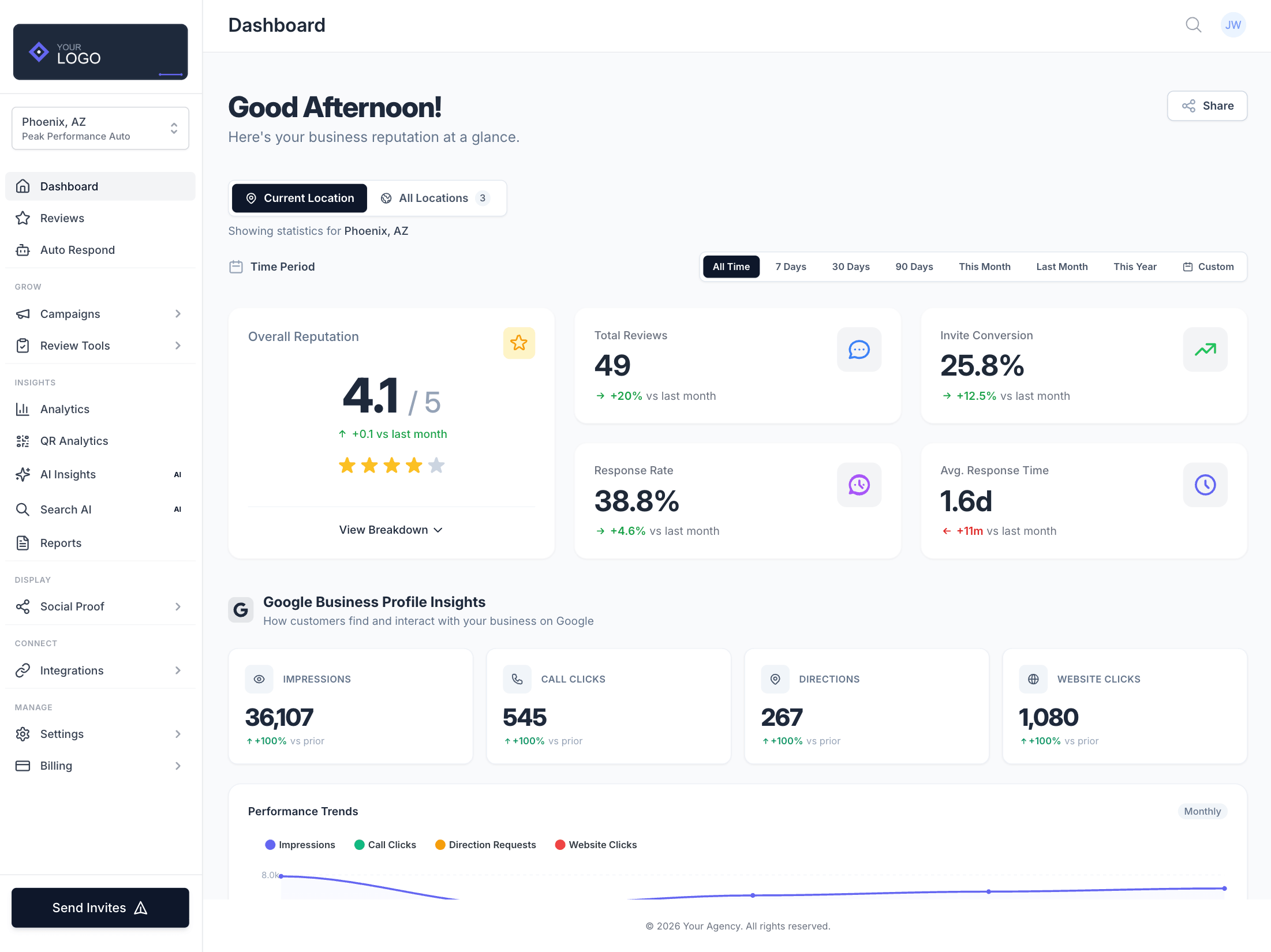 EmbedMyReviews is white-label reputation management software built for agencies, consultants, and operators already serving local businesses. The platform gives agencies full branding control over review generation, AI-powered review responses, local SEO rank tracking, client reporting, and subscription billing under their own domain and brand. Unlike per-location platforms that penalise growth, EmbedMyReviews charges a flat $99/month for unlimited clients and unlimited locations. Agencies keep their margins clean whether they manage ten locations or two hundred. The platform includes Sales Intelligence for AI-powered prospect reports, a Local Search Grid for visual Google Maps rank tracking, AI Insights for review sentiment analysis, Search AI for monitoring visibility across ChatGPT, Gemini, and Perplexity, and 67+ review source integrations worldwide. Agencies in over 40 countries use EmbedMyReviews to deliver reputation management services under their own name.