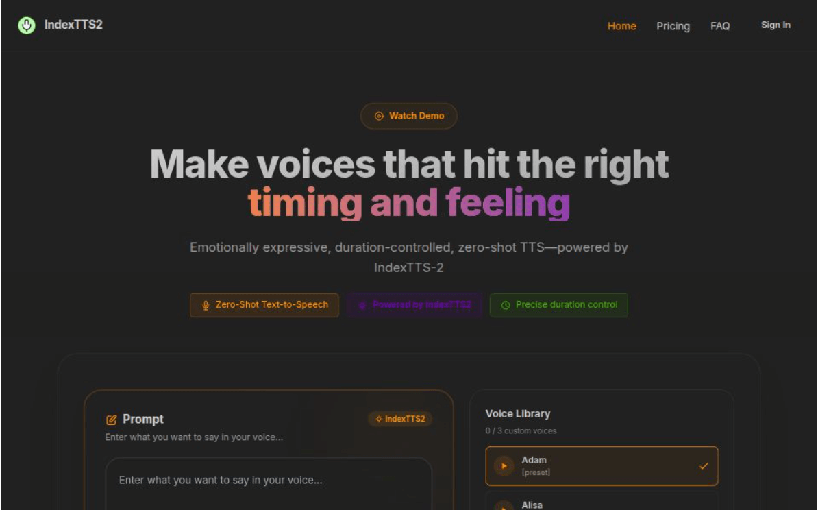 Ready to transform your content with emotionally expressive voiceovers? Visit IndexTTS2 today and discover how this cutting-edge tool can enhance your creative projects. Whether you’re in the film, gaming, podcasting, or education sectors, IndexTTS2 is the ultimate solution for bringing your words to life. Don’t settle for ordinary—choose IndexTTS2 and experience the future of text-to-speech technology.